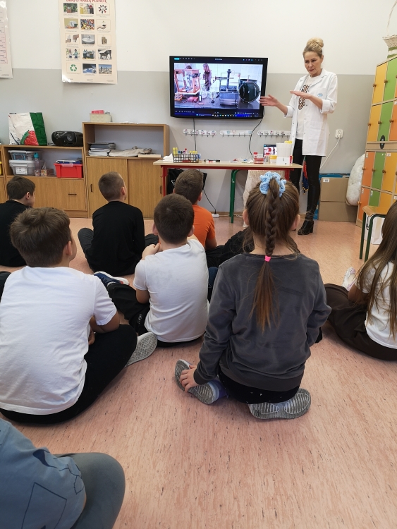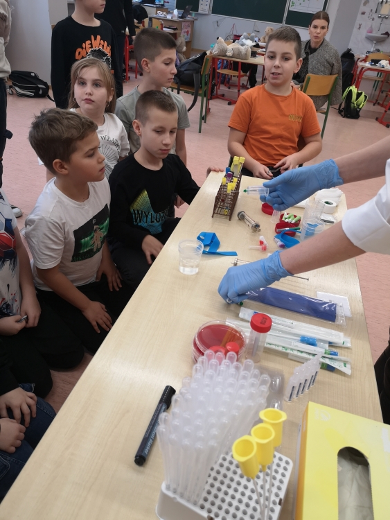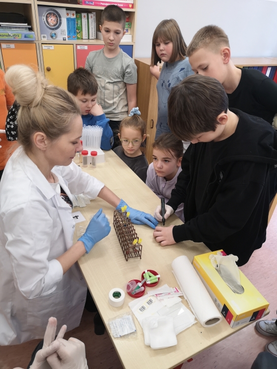 25 listopada uczniowie klasy 3a wzięli udział w spotkaniu z mamą Tymoteusza, która zapoznała ich z pracą diagnosty laboratoryjnego. Opowiedziała, na czym polega jej zawód oraz jakie zadania wykonuje się w laboratorium medycznym. Dzieci dowiedziały się również, jak dawniej wyglądało laboratorium, a jak prezentuje się ono współcześnie w dobie automatyzacji.
