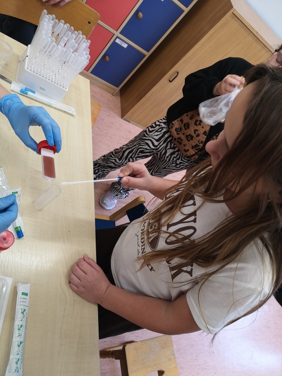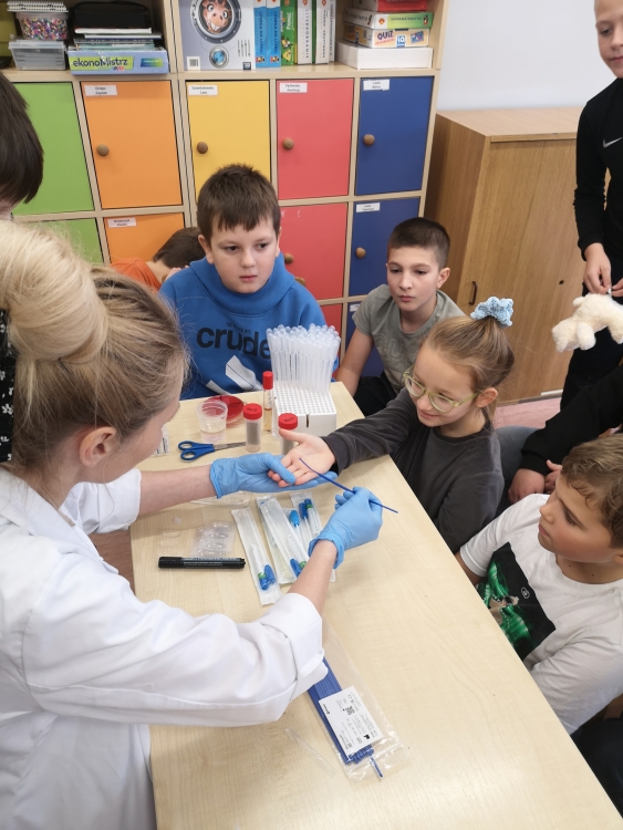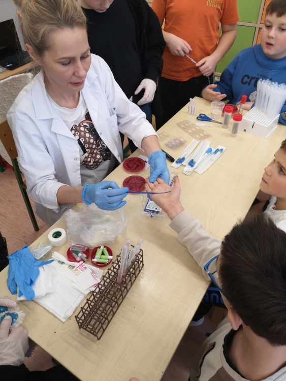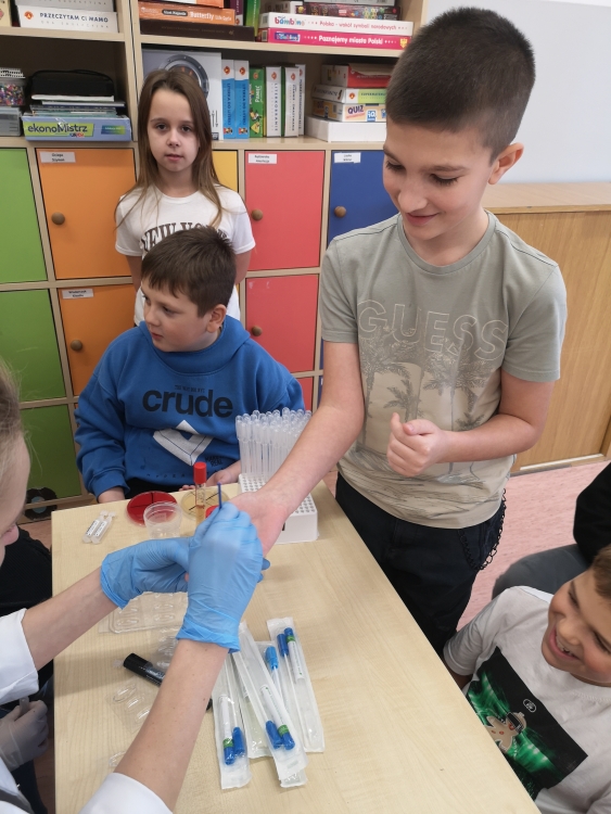 Uczniowie obejrzeli film przedstawiający etapy pobierania krwi oraz przebieg badań wykonywanych przy użyciu nowoczesnych analizatorów laboratoryjnych. Mieli także okazję dowiedzieć się, jak oznacza się grupę krwi.