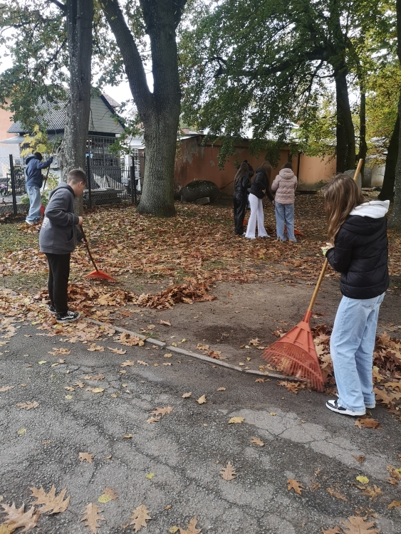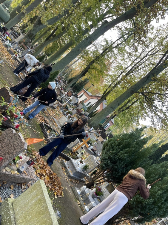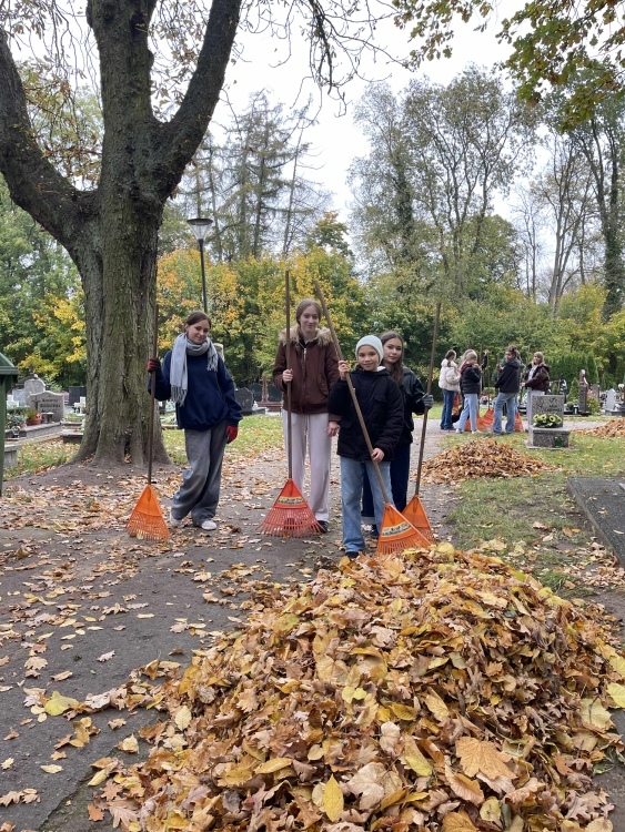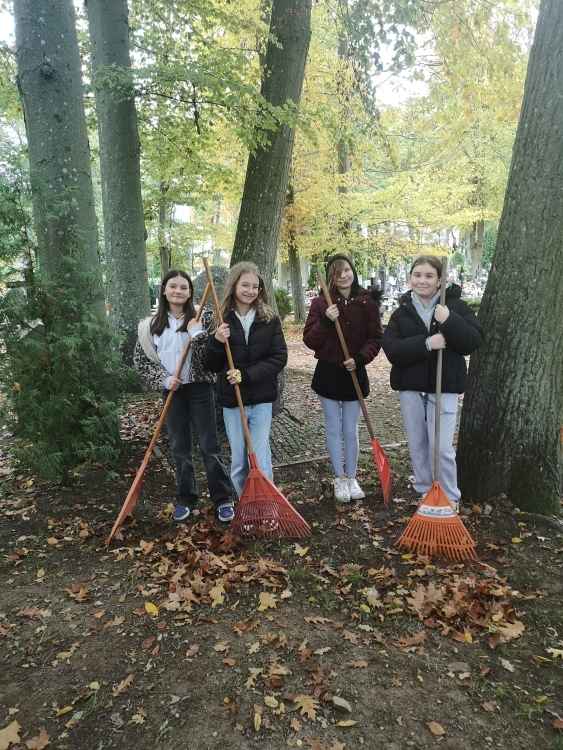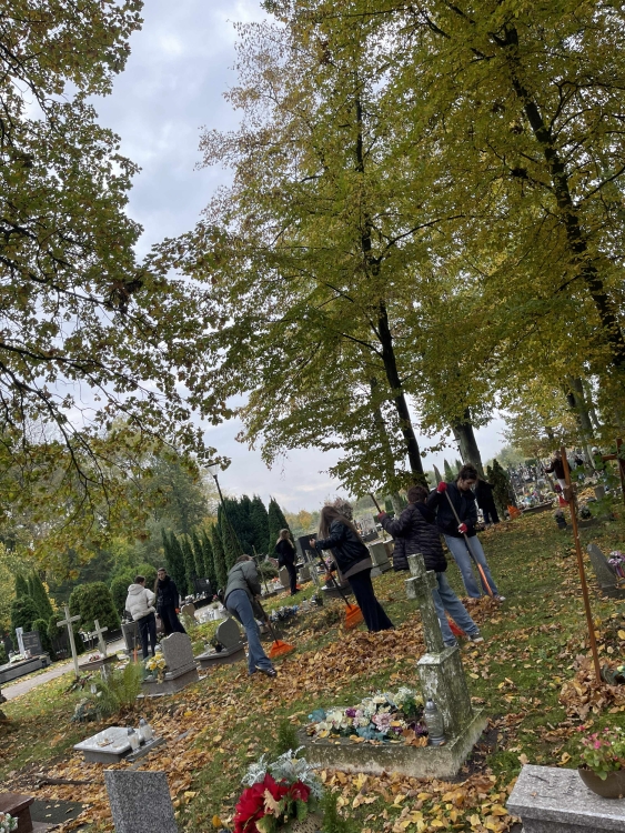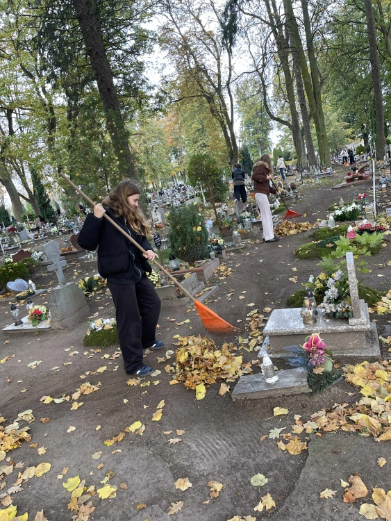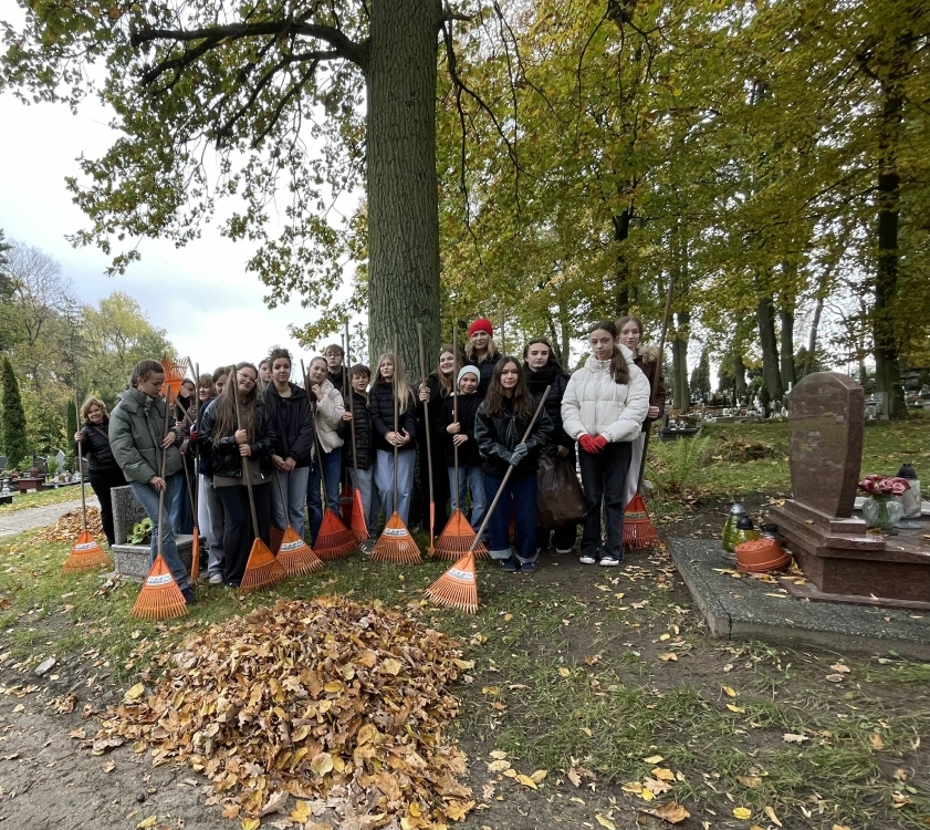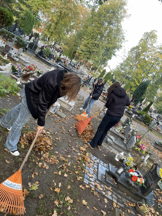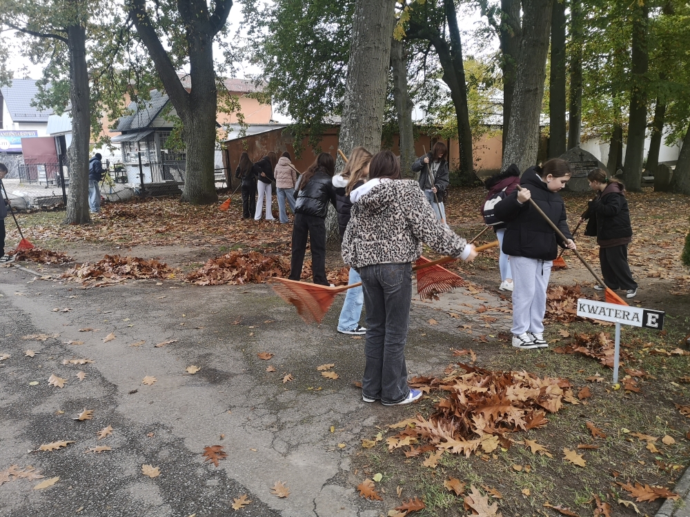 24 i 25 października 2025 r. uczniowie należący do Szkolnego Koła Wolontariatu udali się na miejscowy cmentarz, aby pomóc w jesiennych porządkach. Młodzież z zaangażowaniem grabiła liście, porządkowała alejki oraz dbała o estetyczny wygląd miejsca pamięci.